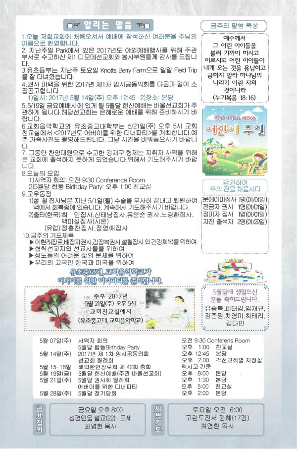 05/07/17 주일 교회 소식 페이지 정보 작성자 댓글 0건 조회 2,711회 작성일 17-05-06 12:52 목록 본문 이전글05/14/17 주일 교회 소식 17.05.13 다음글04/30/17 주일 교회 소식 17.04.29 댓글 0 댓글목록 등록된 댓글이 없습니다. 목록