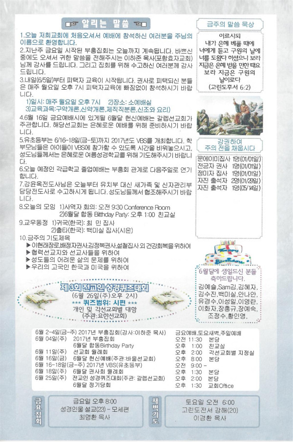 06-04-17 주일 교회 소식 페이지 정보 작성자 댓글 0건 조회 2,867회 작성일 17-06-03 13:54 목록 본문 이전글06/11/17 주일 교회 소식 17.06.10 다음글05-28-17 주일 교회 소식 17.05.27 댓글 0 댓글목록 등록된 댓글이 없습니다. 목록