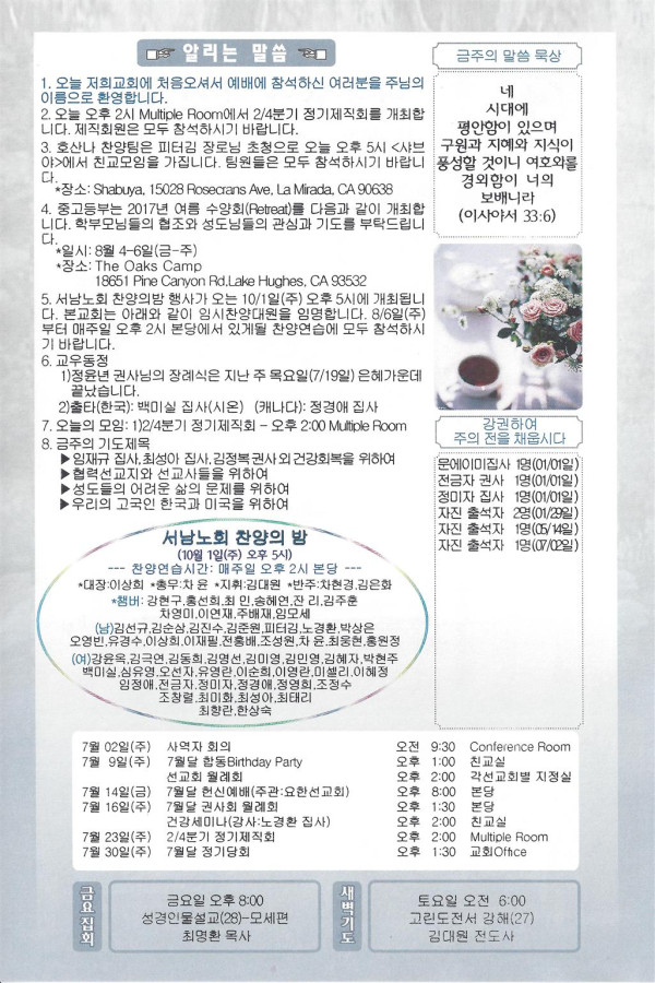07/23/17 주일 교회 소식 페이지 정보 작성자 댓글 0건 조회 2,554회 작성일 17-07-22 09:46 목록 본문 이전글07/30/17 주일 교회 소식 17.07.29 다음글07/16/17 주일 교회 소식 17.07.15 댓글 0 댓글목록 등록된 댓글이 없습니다. 목록