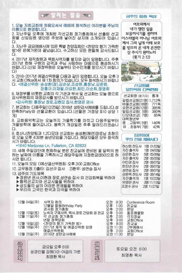 12/18/16 주일 교회 소식 페이지 정보 작성자 댓글 0건 조회 2,634회 작성일 16-12-17 10:57 목록 본문 이전글12/25/16 주일 교회소식 16.12.24 다음글12/11/16 주일 교회 소식 16.12.10 댓글 0 댓글목록 등록된 댓글이 없습니다. 목록