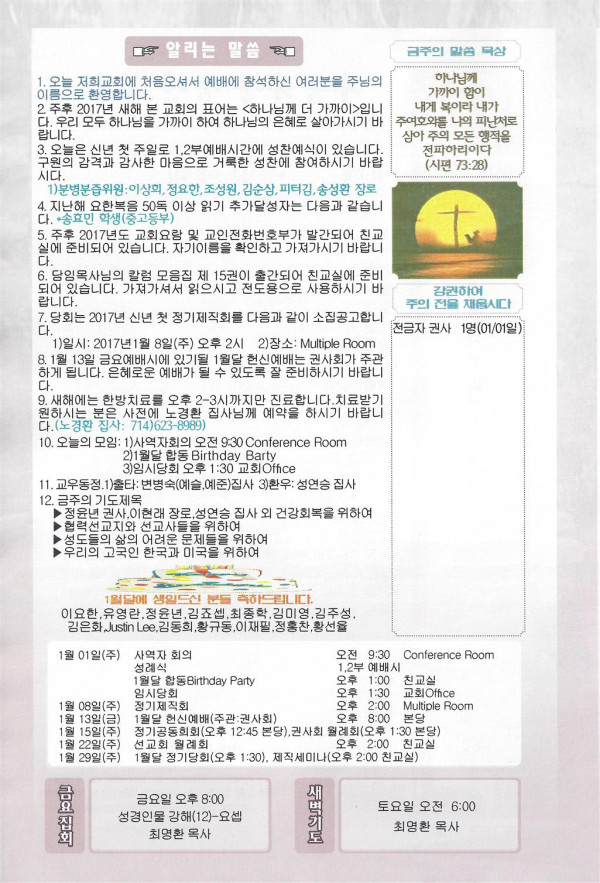 01/01/17 주일 교회 소식 페이지 정보 작성자 댓글 0건 조회 2,393회 작성일 16-12-31 12:44 목록 본문 이전글01/08/17 주일 교회 소식 17.01.07 다음글12/25/16 주일 교회소식 16.12.24 댓글 0 댓글목록 등록된 댓글이 없습니다. 목록