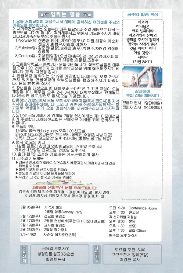 02/05/17 주일 교회 소식 페이지 정보 작성자 댓글 0건 조회 2,615회 작성일 17-02-04 10:05 목록 본문 이전글02/12/17 주일 교회 소식 17.02.11 다음글01/15/17 주일 교회 소식 17.01.14 댓글 0 댓글목록 등록된 댓글이 없습니다. 목록