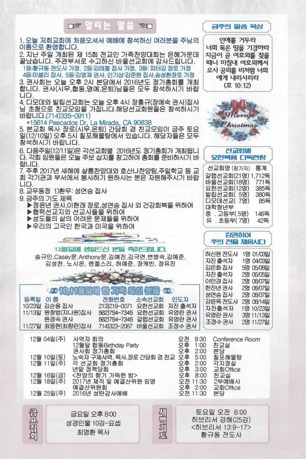 12/04/16 주일 교회 소식 페이지 정보 작성자 댓글 0건 조회 2,549회 작성일 16-12-03 13:31 목록 본문 이전글12/11/16 주일 교회 소식 16.12.10 다음글11/27/16 주일 교회 소식 16.11.26 댓글 0 댓글목록 등록된 댓글이 없습니다. 목록