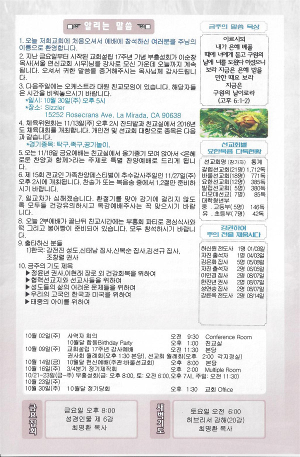 10/23/16 주일 교회 소식 페이지 정보 작성자 댓글 0건 조회 2,423회 작성일 16-10-22 15:38 목록 본문 이전글10/30/16 주일 교회 소식 16.10.29 다음글10/16/16 주일 교회 소식 16.10.15 댓글 0 댓글목록 등록된 댓글이 없습니다. 목록