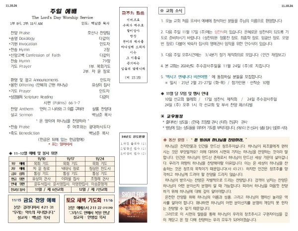 11/10/24 교회 주보 페이지 정보 작성자 아름다운동산교회 댓글 0건 조회 1,685회 작성일 24-11-09 08:05 목록 본문 11/10/24 이전글11/17/24 교회 주보 24.11.16 다음글11/03/24 교회 주보 24.11.02 댓글 0 댓글목록 등록된 댓글이 없습니다. 목록