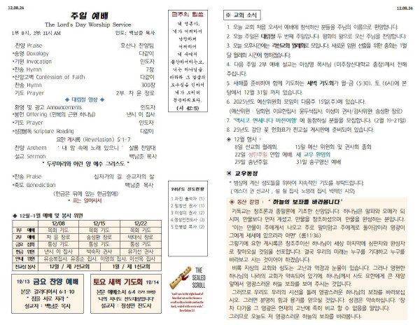 12/08/24 교회 주보 페이지 정보 작성자 아름다운동산교회 댓글 0건 조회 1,832회 작성일 24-12-07 08:35 목록 본문 12/08/24 이전글12/15/24 교회 주보 24.12.14 다음글12/01/24 교회 주보 24.11.30 댓글 0 댓글목록 등록된 댓글이 없습니다. 목록