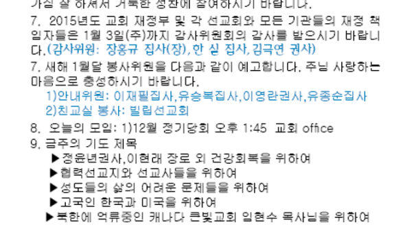 12/27/15 주일 교회 소식