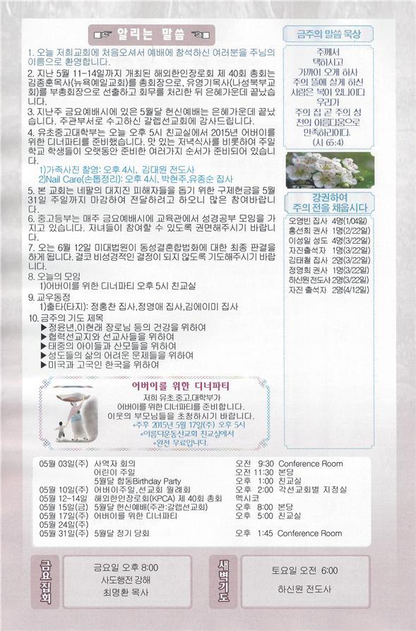 - 다음글05/10/15 주일 교회 소식 15.05.09