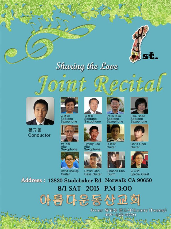 2015년 8월 1일 토요일 오후 3시에 본 교회에서 연주회를 개최하려고 합니다. 이번 연주회를 출발점으로, 구제와 봉사가 필요한 지역교회 및 지역사회를 위한 연주회를 지속적으로 개최하려고 합니다. 오셔서 축하해 주시고, 아름다운동산교회와 연주회를 위해 기도 부탁을 드립니다.