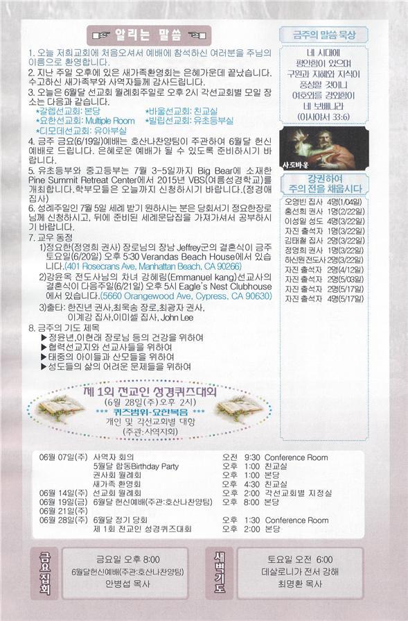 유초등부와 중고등부는 7월 3-5일까지 Big Bear에 소재한 Pine Summit Retreat Center에서 2015년 VBS(여름성경학교)를 개최합니다.학부모들은 오늘까지 신청하시기 바랍니다.(정경애 집사)