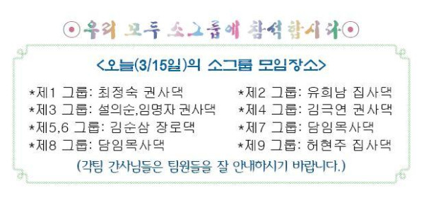 3.오늘오후에도 넷째 주 소그룹 모임을 가집니다. 각그룹 간사님들은 모일 시간과 장소의 약도를 팀원들에게 정확히 알려주시기 바랍니다.