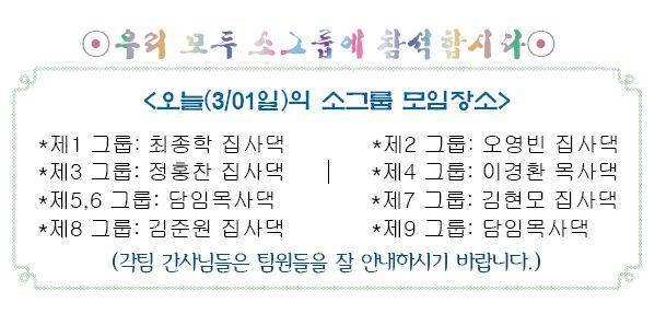 2. 오늘도 각 그룹별 둘째 주 소그룹 모임을 가집니다. 간사님들은 모일 시간과 장소의 약도를 팀원들에게 정확히 알려주시기 바랍니다.