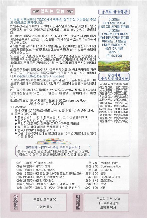 오는 10/10일(금) 오후 8시에 호산나찬양팀 주관으로 찬양연주자 안건마 목사님을 초청하여 교회설립15주년 기념찬양의 밤 행사를 개최합니다. 은혜로운 찬양행사가 될 수 있도록 협조해주시기 바랍니다.
