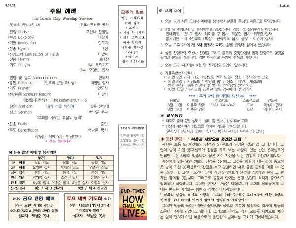 8/25/24 교회 주보 페이지 정보 작성자 아름다운동산교회 댓글 0건 조회 2,093회 작성일 24-08-24 07:09 목록 본문 8/25/24 이전글09/01/24 교회 주보 24.08.31 다음글08/18/24 교회 주보 24.08.17 댓글 0 댓글목록 등록된 댓글이 없습니다. 목록