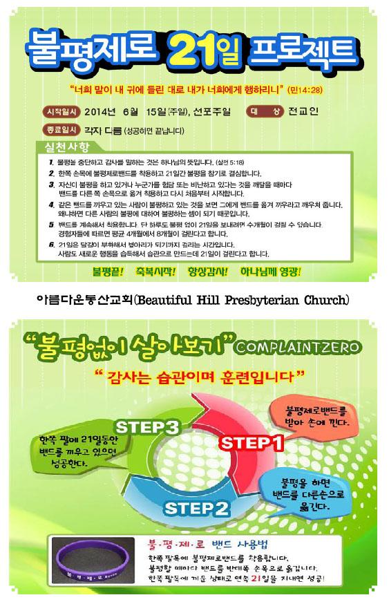 본 교회는 오늘부터 21일 동안 불평을 없애고 감사의 삶을 훈련하는 <불평제로 21일 캠페인>을 시작합니다. 불평제로 21일을 달성하신 1,2,3등에게는 담임목사 제공의 상품을 드립니다.