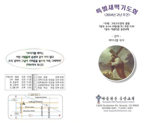 내일부터 한주간(4/14-19,월-토)은 매일 오전 5:30에 고난주간 특별새벽기도회를 개최합니다. 특별새벽기도회를 통해 주님의 고난에 동참하시고 기도하는 한 주간이 되시기 바랍니다.(매일 아침식사 준비됨)