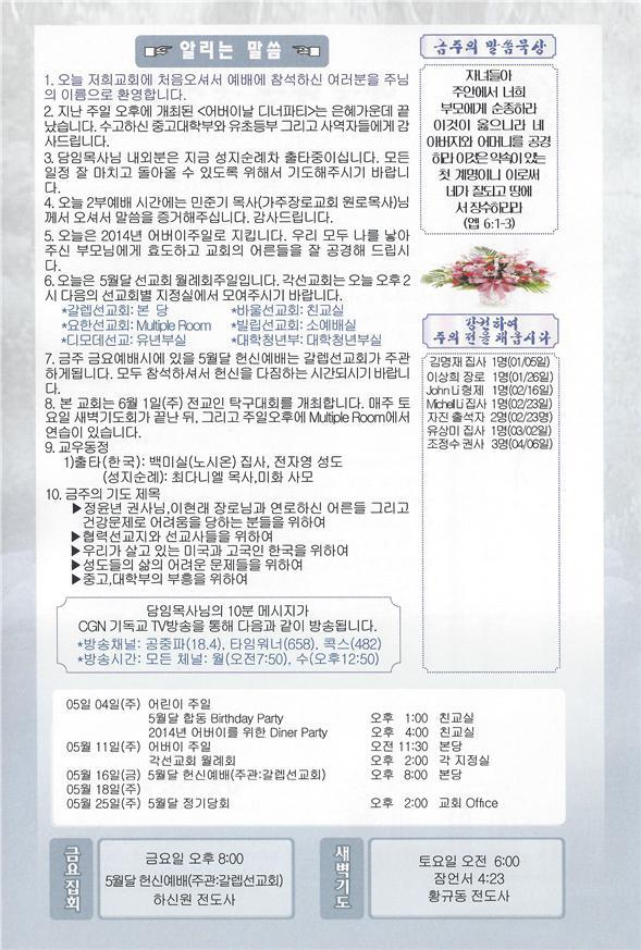 - 다음글05/04/14 주일 교회 소식 14.05.04