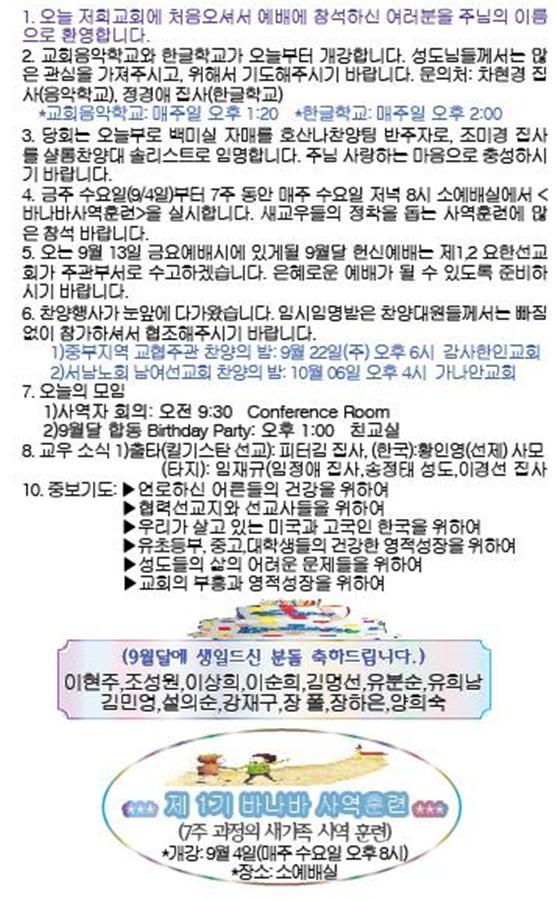 *금주 수요일(9/4일)부터 7주 동안 매주 수요일 저녁 8시 소예배실에서 <바나바사역훈련>을 실시합니다. 새교우들의 정착을 돕는 사역훈련에 많은 참석 바랍니다.