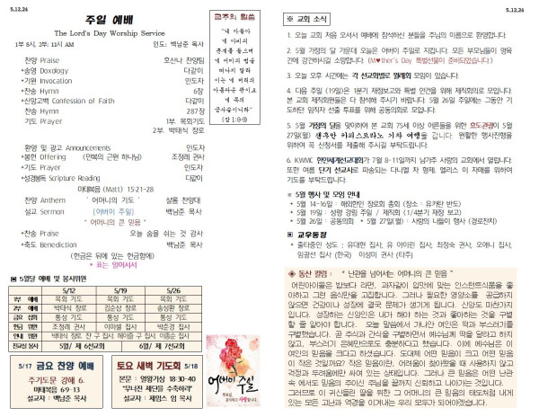 05/12/24 교회 주보 페이지 정보 작성자 아름다운동산교회 댓글 0건 조회 2,123회 작성일 24-05-11 06:54 목록 본문 05/12/24 이전글05/19/24 교회 주보 24.05.18 다음글05/05/24 교회 주보 24.05.04 댓글 0 댓글목록 등록된 댓글이 없습니다. 목록
