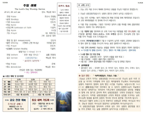 05/19/24 교회 주보 페이지 정보 작성자 아름다운동산교회 댓글 0건 조회 2,421회 작성일 24-05-18 07:01 목록 본문 05/19/24 이전글05/26/24 교회 주보 24.05.25 다음글05/12/24 교회 주보 24.05.11 댓글 0 댓글목록 등록된 댓글이 없습니다. 목록