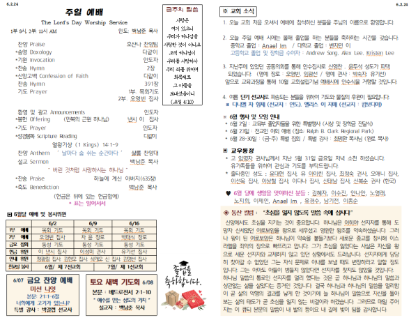 6/2/24 주일 주보 페이지 정보 작성자 아름다운동산교회 댓글 0건 조회 1,889회 작성일 24-06-02 14:09 목록 본문 6월 2일 주일 주보 이전글06/09/24 교회 주보 24.06.08 다음글05/26/24 교회 주보 24.05.25 댓글 0 댓글목록 등록된 댓글이 없습니다. 목록