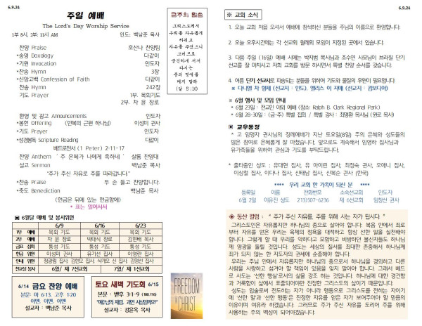 06/09/24 교회 주보 페이지 정보 작성자 아름다운동산교회 댓글 0건 조회 2,210회 작성일 24-06-08 06:36 목록 본문 06/09/24 이전글6/19/24 주일 주보 24.06.15 다음글6/2/24 주일 주보 24.06.02 댓글 0 댓글목록 등록된 댓글이 없습니다. 목록