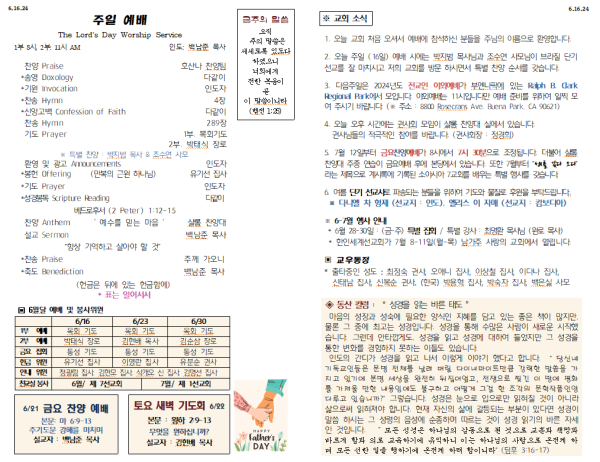6/19/24 주일 주보 페이지 정보 작성자 아름다운동산교회 댓글 0건 조회 2,424회 작성일 24-06-15 08:34 목록 본문 주일 주보 이전글6/23/24 주보 24.06.25 다음글06/09/24 교회 주보 24.06.08 댓글 0 댓글목록 등록된 댓글이 없습니다. 목록