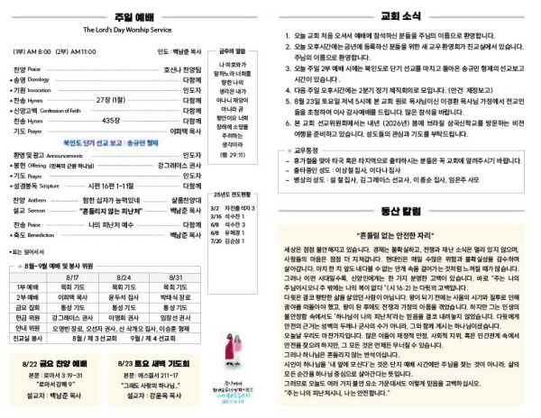 08/17/25 교회 주보 페이지 정보 작성자 아름다운동산교회 댓글 0건 조회 392회 작성일 25-08-16 07:21 목록 본문 08/17/25 이전글08/24/25 교회 주보 25.08.23 다음글08/10/25 교회 주보 25.08.09 댓글 0 댓글목록 등록된 댓글이 없습니다. 목록