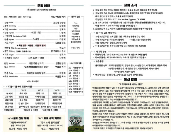 10/05/25 교회 주보 페이지 정보 작성자 아름다운동산교회 댓글 0건 조회 122회 작성일 25-10-04 07:15 목록 본문 10/05/25 이전글10/12/25 교회 주보 25.10.11 다음글09/28/25 교회 주보 25.09.27 댓글 0 댓글목록 등록된 댓글이 없습니다. 목록
